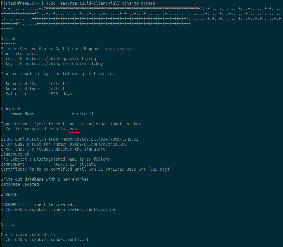 To create a full set of certificates for a client, named client1, with no password (nopass) on the private key, run: