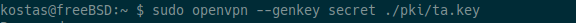 Now we will generate a symmetric key ( shared secret key ), which is stored in the ta.key file. This key is used by OpenVPN for the so-called TLS authentication (HMAC) or tls-auth / tls-crypt.