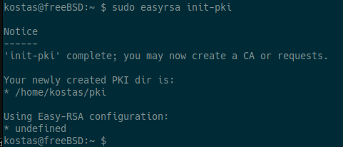 To do anything useful, Easy-RSA must first initialize a directory for the PKI. Multiple PKIs can be managed with a single installation of Easy-RSA, but the default directory is simply named "pki" unless otherwise specified.
