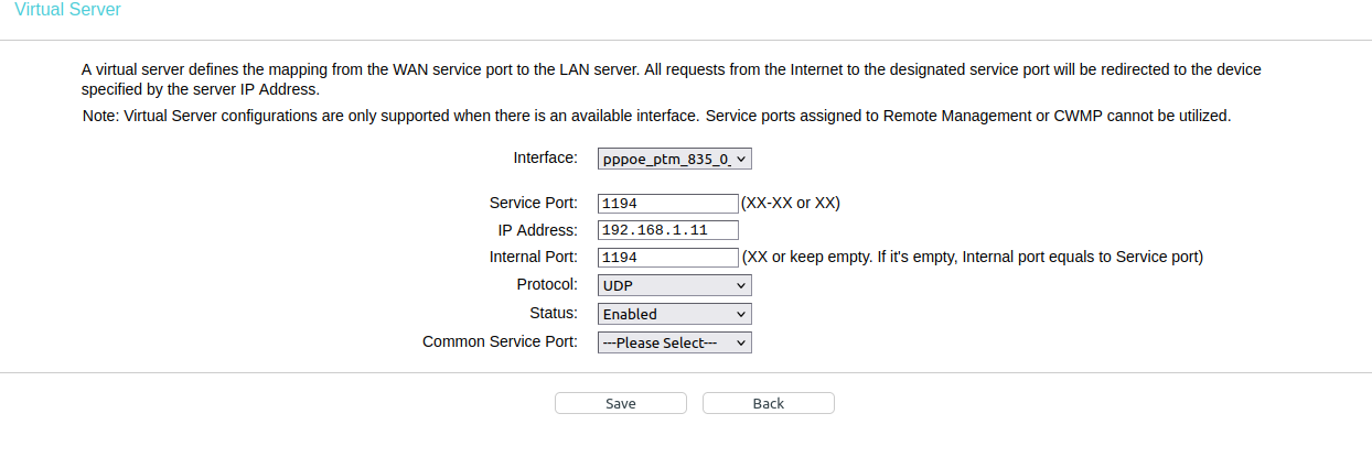 We enter the router settings for port forwarding and match the IP of our server on the LAN with the port we have set in OpenVPN (e.g. 1194), and the protocol (which here is UDP).