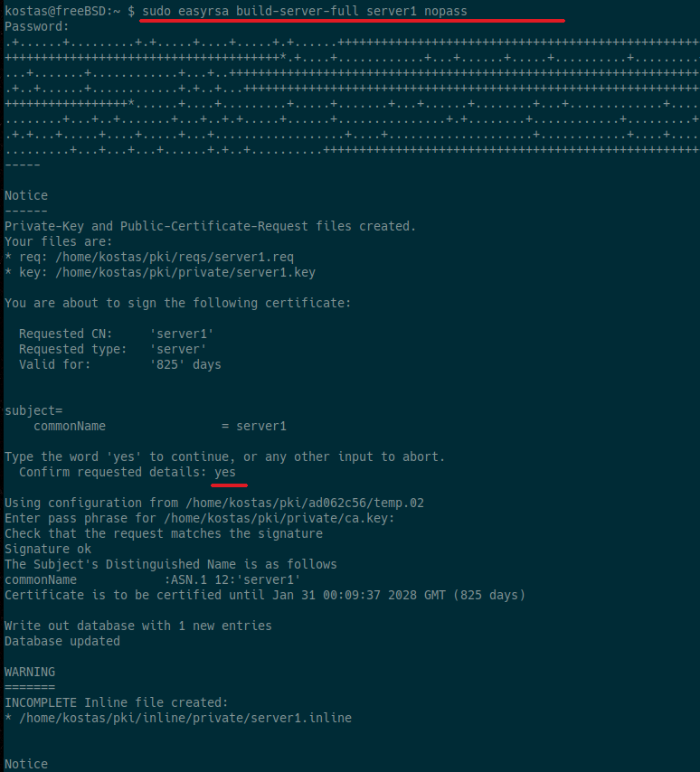 To create a full set of certificates for a server, named server1, with no password (nopass) on the private key, run: