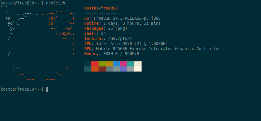 In our example we will use a 32-bit freeBSD system, on an old laptop directly to its hardware, in the example we have connected remotely with ssh.
